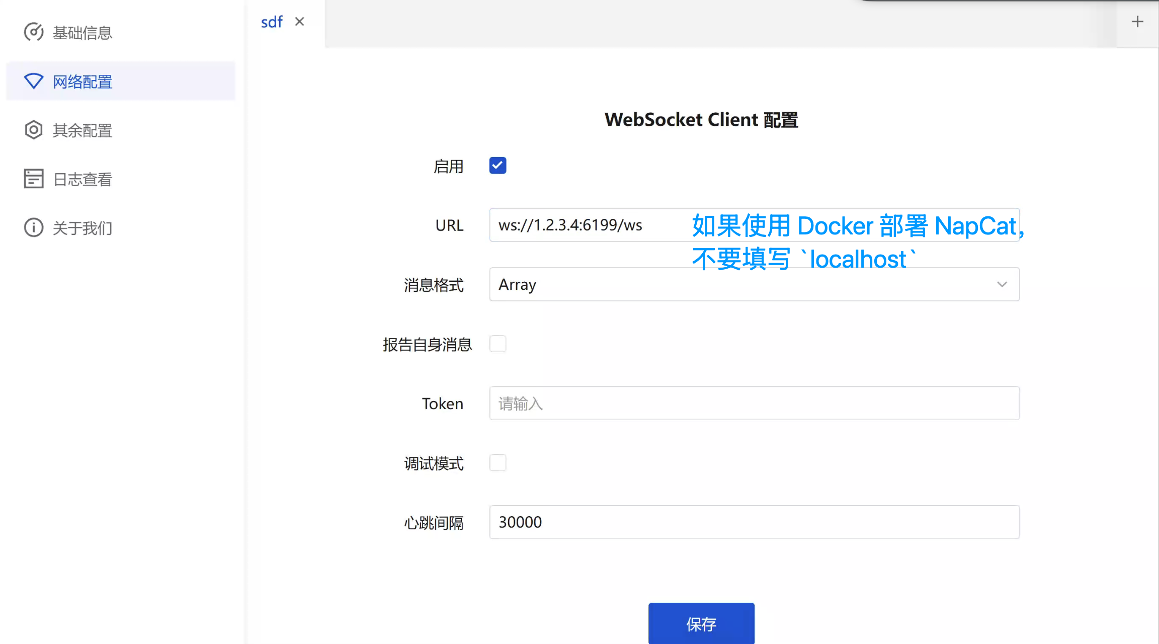 切换回 NapCatQQ 管理面板,点击 网络配置 -> 添加网络配置,名称随意填写,类型选择 WebSocket 客户端。填写: